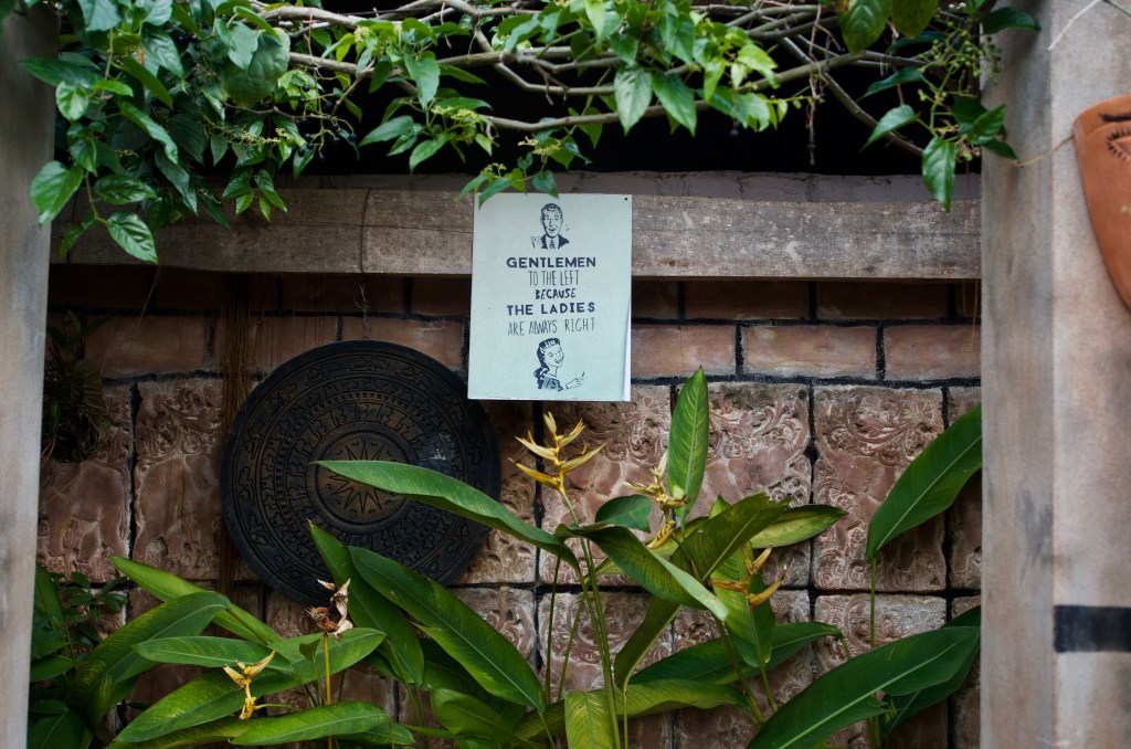 Our BikesThe route looks so straightforward – crazy that we turned the wrong way.Path through the rice fields – on our way to town by bike. This is one of the dining/lounging areas – our favourite place for dinner.Entrance to the restaurantLove the washroom signFloating bridgeChildren from the local villageWonderful spot in the main lodge to relax